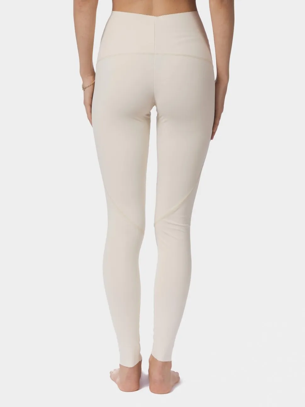 Højtaljede leggings med bølgekant i taljen. De er lavet i et materiale med stræk. Modellen er iført størrelse 36.