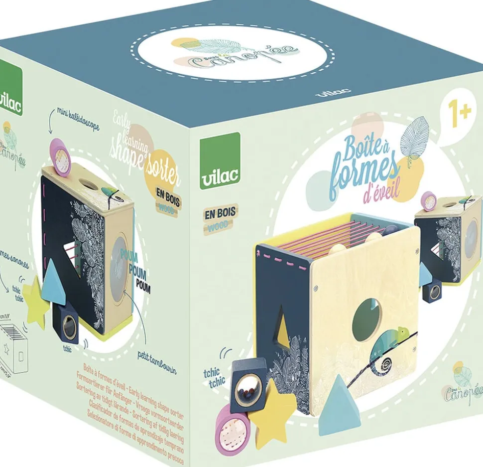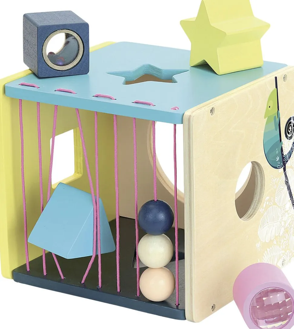 Puttekasse i lyst træ med snore, så barnet både kan putte formerne ind i de rigtige huller, men også igennem snorene.