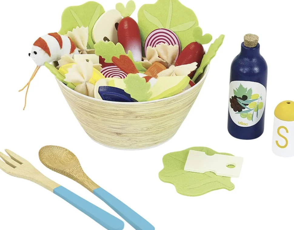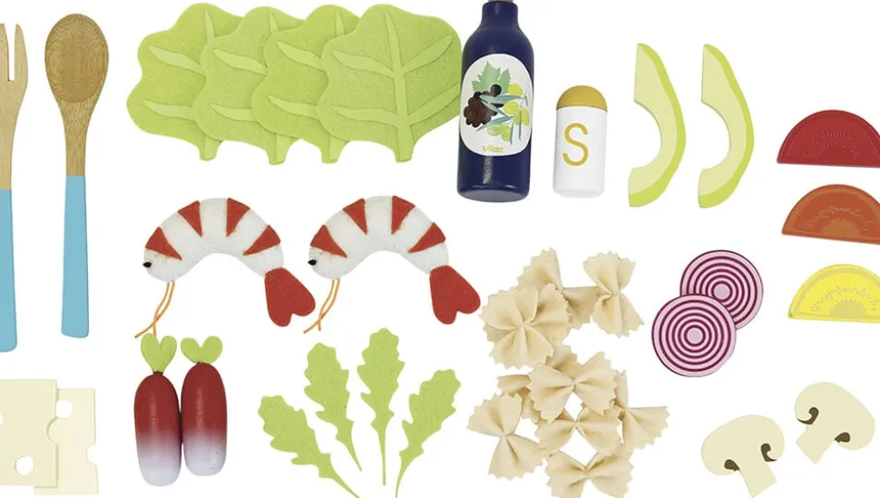 Salatskål med alle ingredienser til en lækker salat. 40 stykker tilbehør: 1 stor bambusskål, 2 salatskeer, 1 flaske salatdressing, 1 saltbøsse, 2 skiver champignon, 1 skiver avocado, 4 skiver tomat, 2 radiser, 2 løg, 11 pastaer, 2 rejer, 4 rucolasalat og 4 alm. salat og 2 skiver ost. Leveres i en handy box.