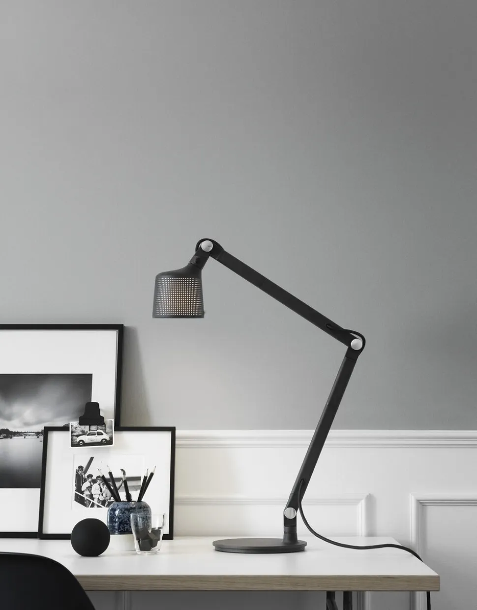 Vipp bordlampen er udstyret med analoge detaljer såsom en justérbar arm til fokuseret lys, fingerskruer til at låse lampens position og en solid base for stabilitet. Lampen er nøjsomt forarbejdet i pulverlakeret aluminium, og en perforeret skal kombineret med matteret, støbt glas sikrer en behagelig diffusion af lys. Grundet den hurtige udvikling inden for LED teknologi har alle Vipp lamper en udskiftelig LED lyskilde. Det gør det muligt for dig løbende at opdatere din Vipp lampe til bedste lyskvalitet og giver dig en lampe, der er tidløs i både design og funktion.