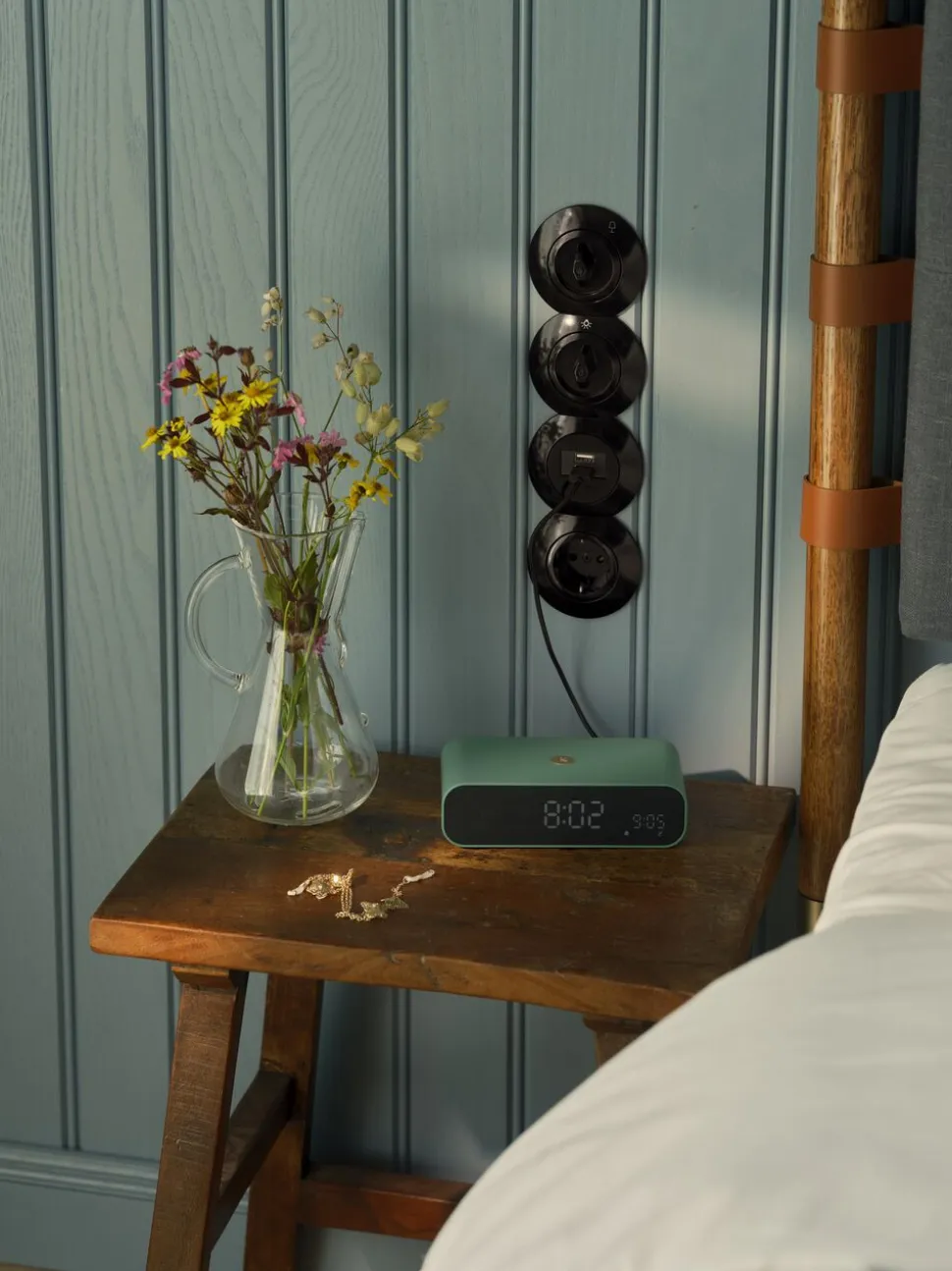 Inden sengetid kan du lægge mobilen ovenpå Wakie – den oplader trådløst, mens du hviler. Og med den indbyggede højttaler kan du nyde din musik, mens du gør dig klar.