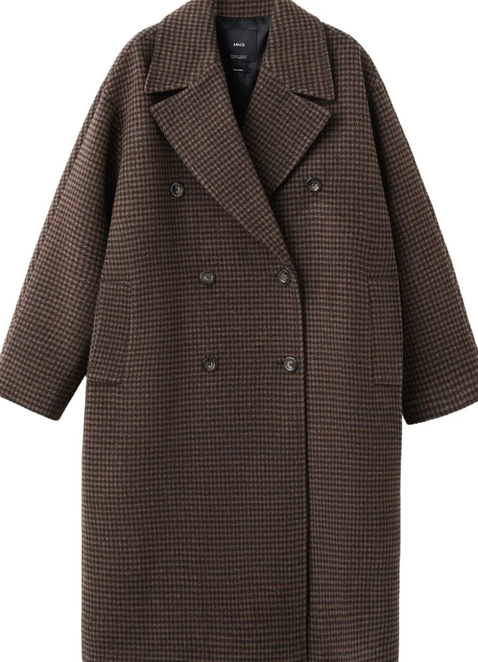 Uldblanding, indvendig foring, oversized Design, langt Design, mikrohanefjedsmønstret tryk, krave med v-hals, revers med hak, lange ærmer, to lommer med kantning i siderne, dobbelt knaplukning.