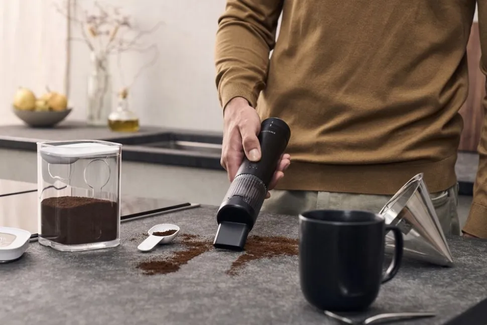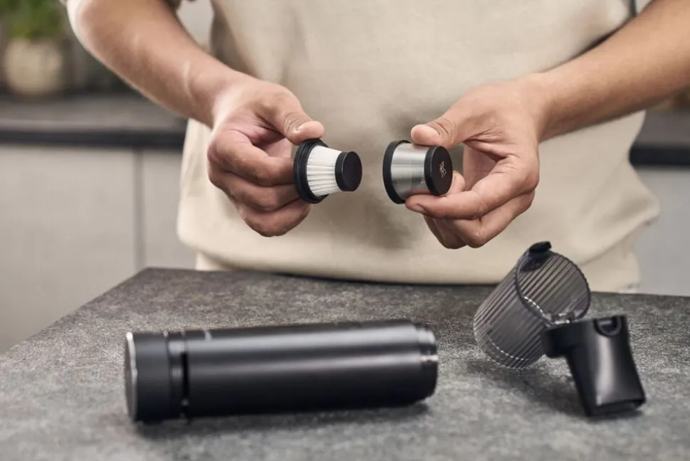 Lille, kraftfuld, ledningsfri: Tag hygiejnen i dit køkken til nye højder med ZWILLING XTEND-håndstøvsugeren. Med to forskellige mundstykker til ujævne og svært tilgængelige overflader. Ekstra hygiejnisk takket være Dual Filter System: Slidstærkt filter i rustfrit stål og med udskifteligt HEPA-filter, der opfanger fine støvpartikler og allergener. Her kommer brødkrummer, kaffepulver, støv, salt og andet finkornet snavs til kort. Fremragende kapacitet på 3 Ah: Med et fuldt opladet batteri kan du støvsuge ledningsfrit i op til 45 minutter*. Og det med samme ydeevne som en ledningsbaseret støvsuger. Når batteriet skal oplades, sætter du det bare i den medfølgende kompakte ladestation. Det gør desuden dine batterier anvendelige som powerbank, så du også kan oplade andre enheder på farten. Du kan naturligvis også bruge batteriet med de andre apparater i ZWILLING XTEND Cordless-serien. ?*Målt med fuldt opladet batteri og rene filtre. Den faktiske driftstid kan variere afhængigt af typen og støvmængden samt filtrenes og batteriets tilstand.