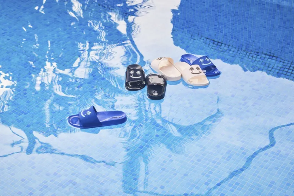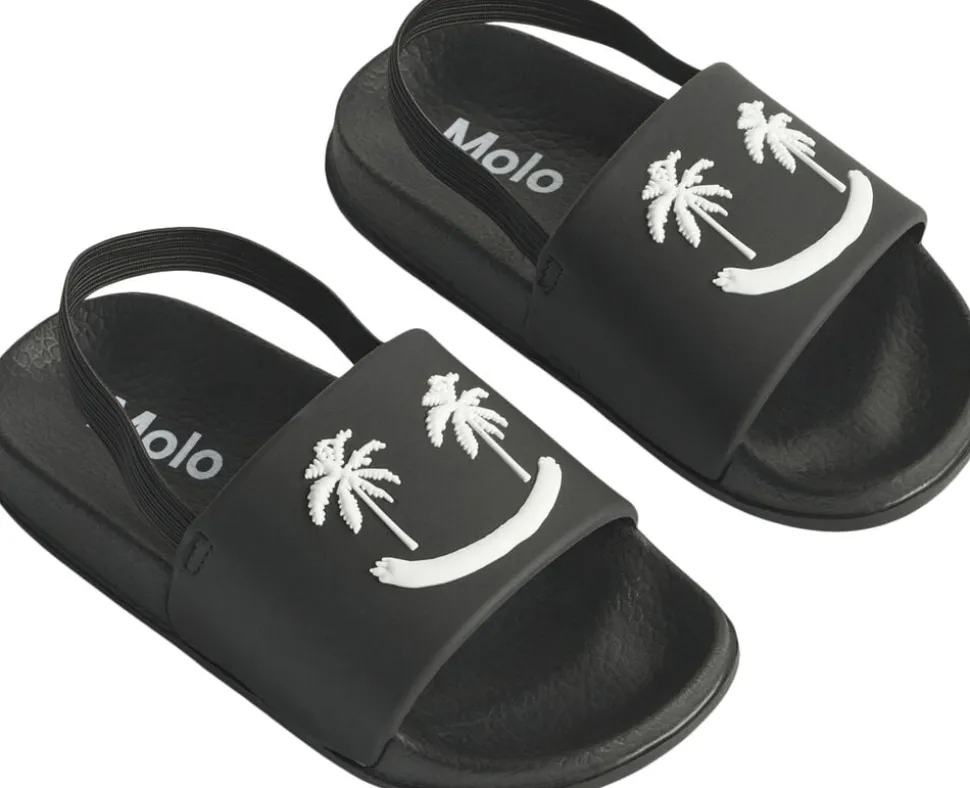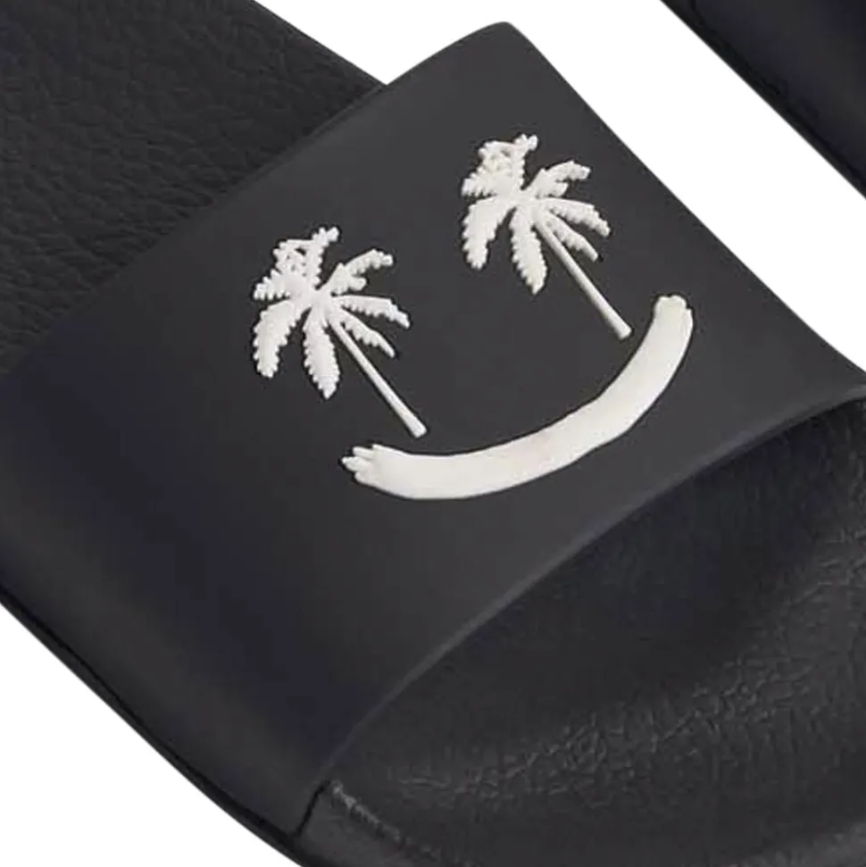Badesandaler med bred fodrem og formstøbt indersål. Disse sandaler er vandafvisende og ideelle til både poolen og stranden. Fodremmen prydes af et smilende ansigt med palmeøjne.